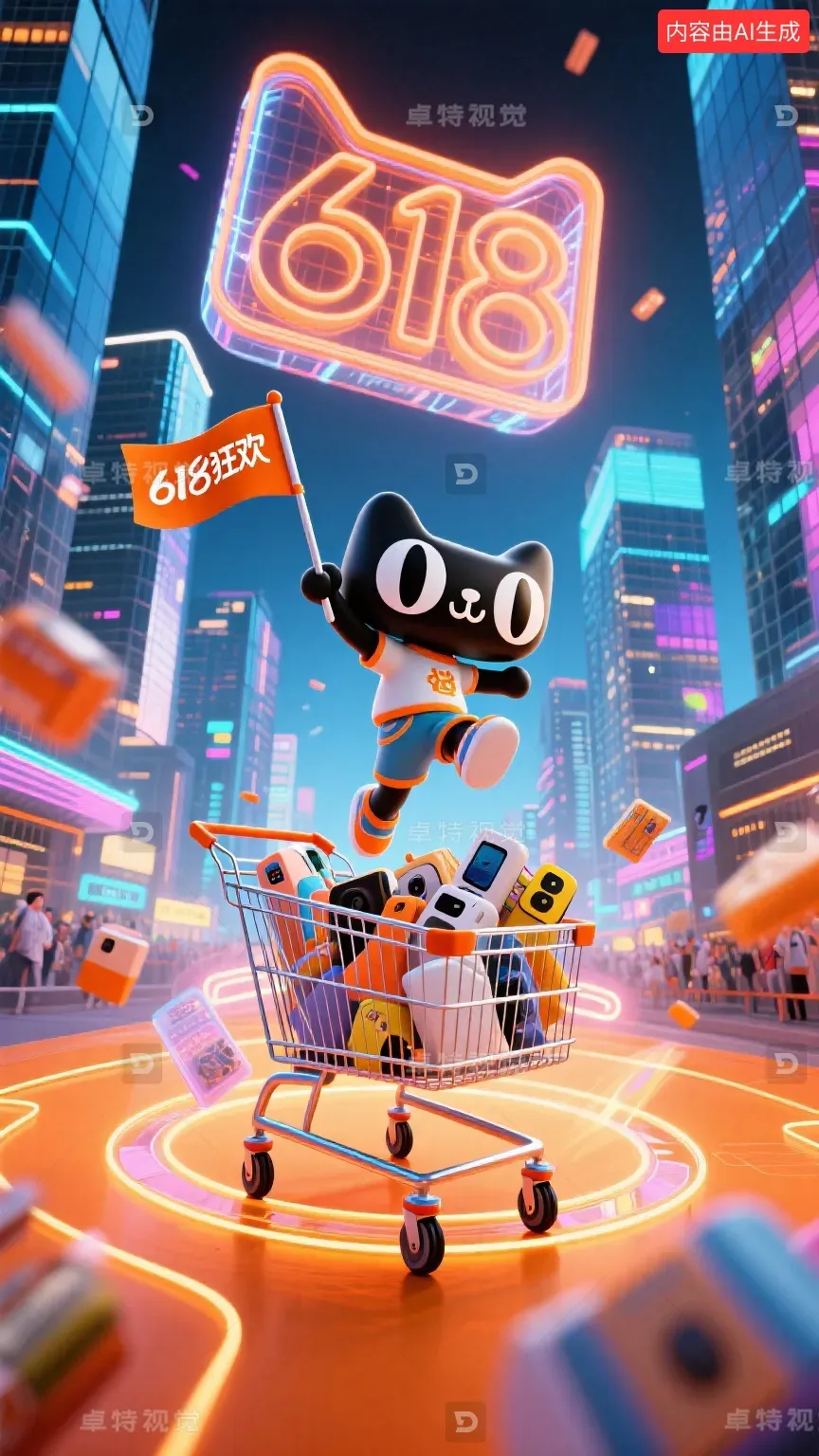 星际潮流酷炫风格,全景广角摄影,活力橙色与科技蓝碰撞主色调。画面中心,一只超级可爱的巨大黑色天猫人偶,身着潮流夏装,正从堆满618爆款商品(时尚电子产品、夏季潮流服饰等)的购物车旁腾空跃起!购物车环绕着流光溢彩的霓虹灯带与未来感全息投影光效。天猫人偶一手挥舞着醒目的“618狂欢”旗帜,表情活力四射,营造出极致热闹的购物狂欢氛围。背景是赛博朋克风格的城市天际线,高耸的玻璃幕墙建筑反射着绚烂灯光。画面顶部,悬浮的巨型全息霓虹灯牌闪烁着立体炫目的“618”主标题。强烈光影对比与动态模糊效果,商品细节高度清晰(可见服饰纹理、电子产品标识),高清画质。
